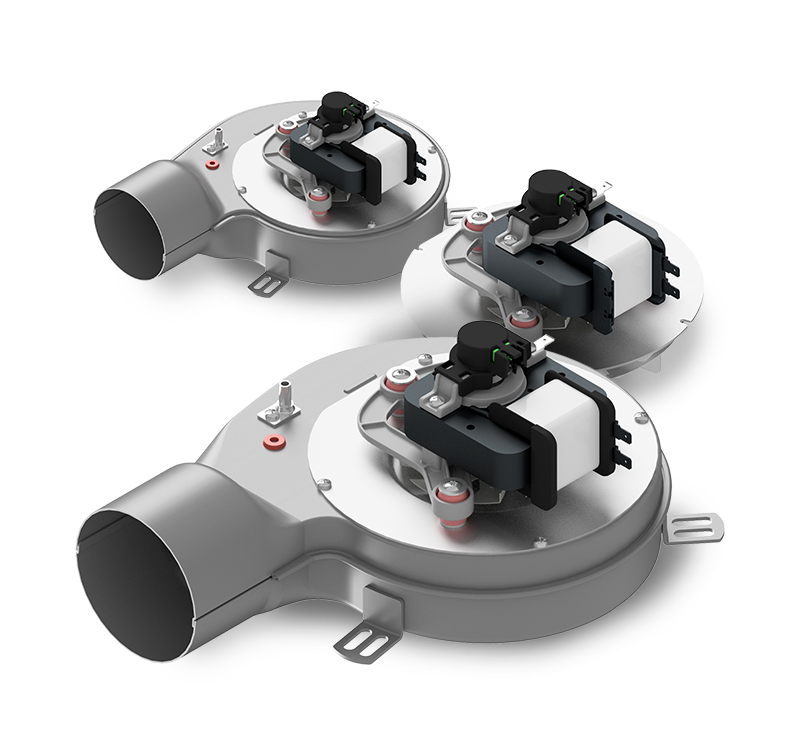 Estrattore fumi disponibile con motore a poli schermati o con motore a condensatore ad alta efficienza, chiocciola e girante in lamiera AISI 430.