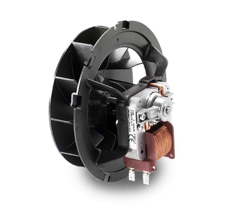 Motori a poli schermati completi di girante per il raffreddamento della maniglia e dell’elettronica a bordo di forni domestici e professionali. Disponibili in versione tangenziale con coclea in lamiera o versione centrifuga con supporto motore in plastica.